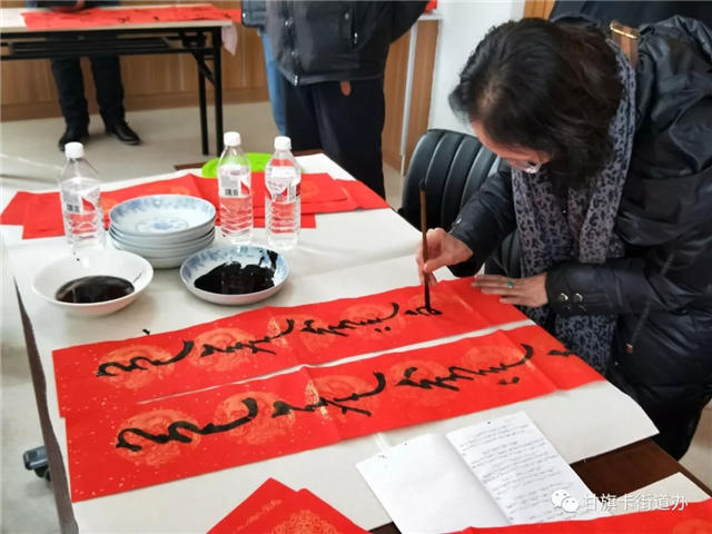 紅紅的春聯,濃濃的墨香,一幅幅春聯寄托著人們的憧憬和向往,同時也飽含著內蒙古文聯文藝志愿服務團的精湛技藝和赤子情懷。活動現場,書法家們揮毫潑墨,把最美好的祝福和希冀,揮灑在春聯上,抒發于筆墨中,為群眾送上2018的第一份美好祝福。書法家們還別出心裁地提供現場“個性化服務”,現場向居民們介紹了對聯的中平仄、韻腳、字意的相關知識,引來在場群眾連連稱贊。活動中書法家們始終以飽滿的熱情與親和的態度,為在場的群眾奉獻一場精致高雅的文化盛宴,用真心和汗水換來了群眾幸福滿意的笑容。
