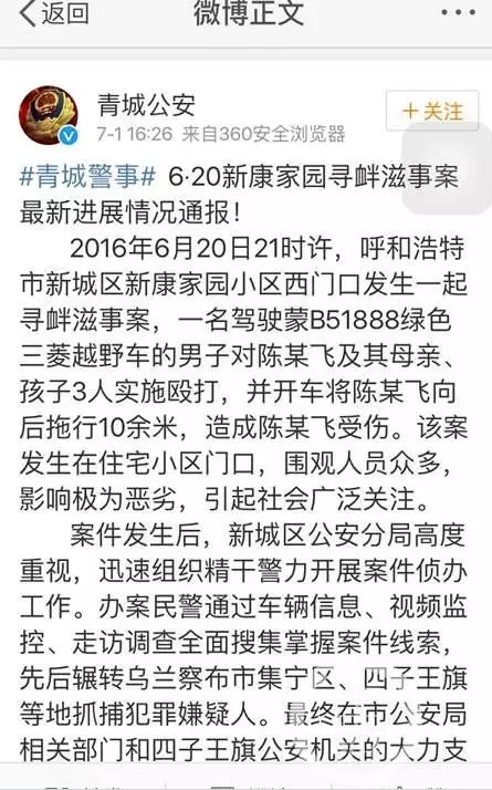 7月1日下午4:26,@青城公安 就這一影響惡劣、引發社會廣泛關注的尋釁滋事案,發布最新進展通報。