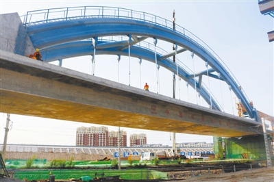 該項施工在國內屬于首例。1-64m鋼管混凝土簡支拱成功轉體落梁,打通了京通左線、通霍單線、京通右線三條接入通遼站高速場的最關鍵的一條線路,為8月9日通遼站高速場開通創造了必備條件。
