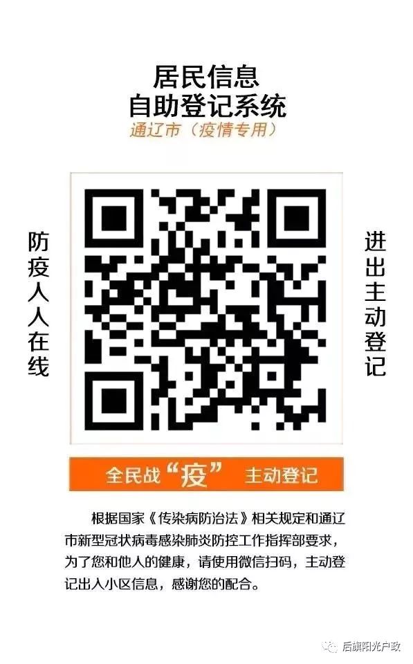 1、居民小區進出人員自助登記系統。凡在我旗居民小區、嘎查村居住的人員(包括所有常住人口、暫住人口和流動人口),必須主動通過手機掃描居民小區進出人員自助登記系統二維碼,申報登記個人信息后,方可出入小區和嘎查村。