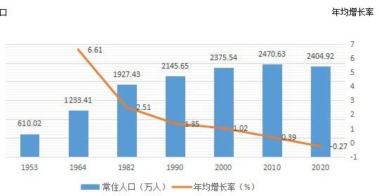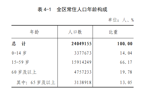 全區常住人口為24049155人,與2010年(第六次全國人口普查數據,下同)的24706321人相比,減少657166人,減少2.66%,年平均增長率為-0.27%,比2000年到2010年的年平均增長率0.39%下降0.66個百分點。