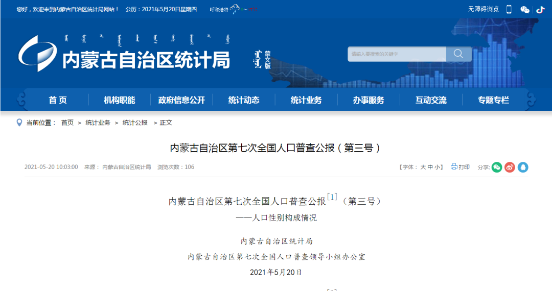 2021年5月20日上午,內蒙古自治區政府新聞辦公室召開內蒙古自治區第七次全國人口普查主要數據結果新聞發布會,自治區第七次全國人口普查領導小組副組長、自治區第七次全國人口普查領導小組辦公室主任、自治區統計局局長潘志峰,對內蒙古自治區第七次全國人口普查主要數據結果進行發布。