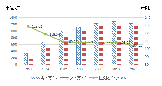 根據第七次全國人口普查結果,現將2020年11月1日零時我區12個盟市常住人口[2]性別構成情況公布如下:全區常住人口中,男性人口為12275274人,占51.04%;女性人口為11773881人,占48.96 %。常住人口性別比(以女性為100,男性對女性的比例)為104.26,與2010年第六次全國人口普查的108.05相比,下降3.79。